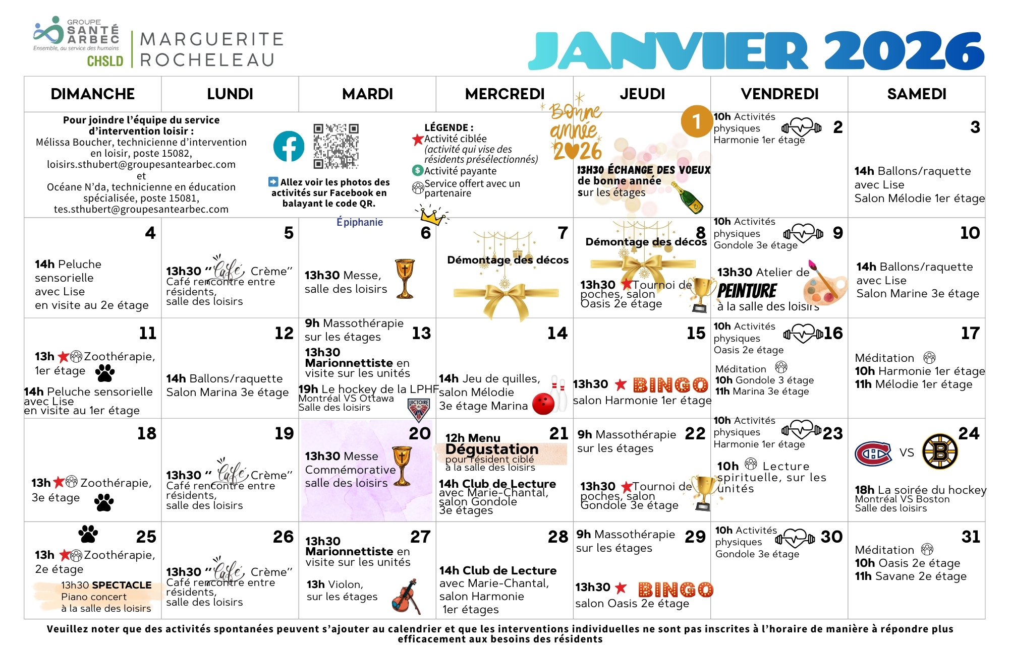 Activités de loisirs du mois de janvier 2026 pour les résidents du CHSLD Marguerite-Rocheleau