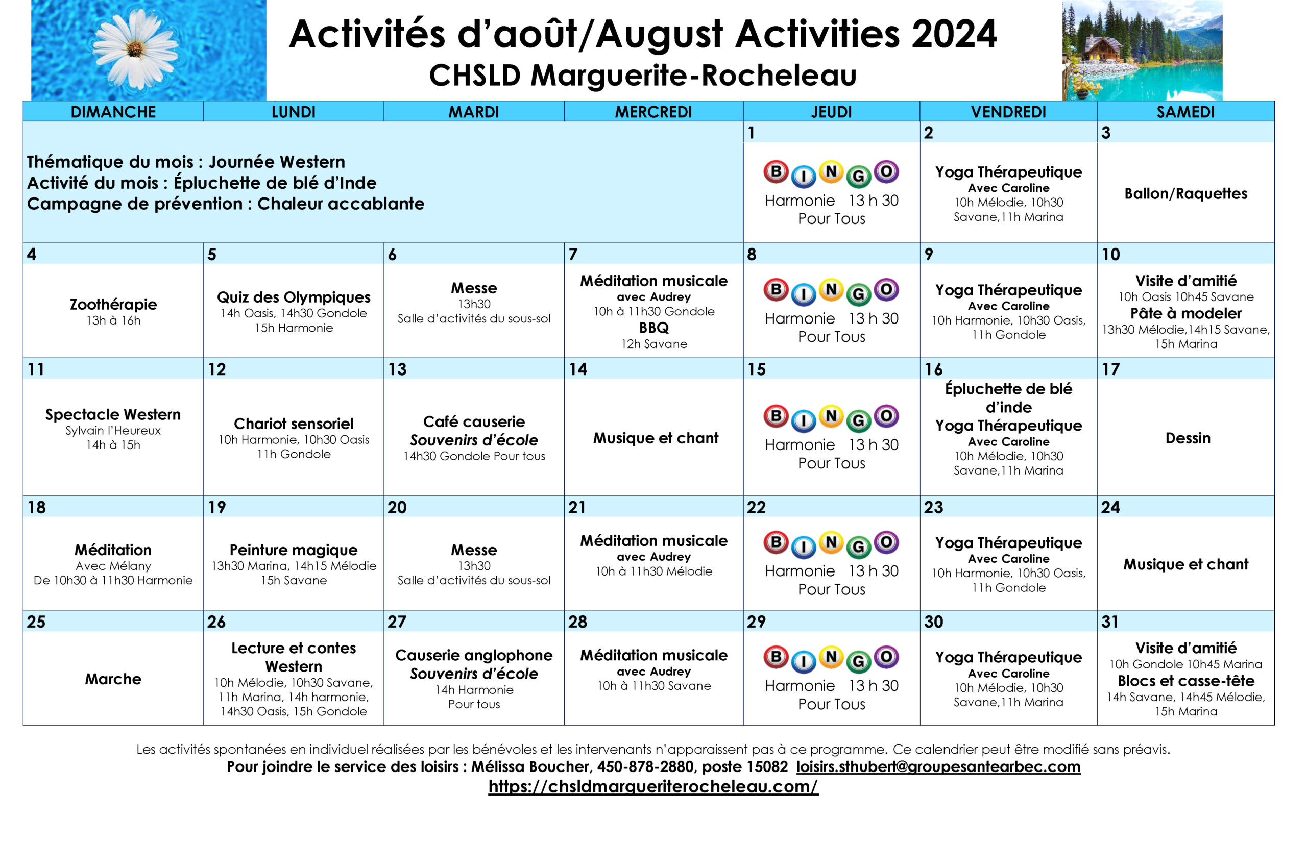 Calendrier des loisirs du mois d’août 2024 pour les résidents du CHSLD Marguerite-Rocheleau