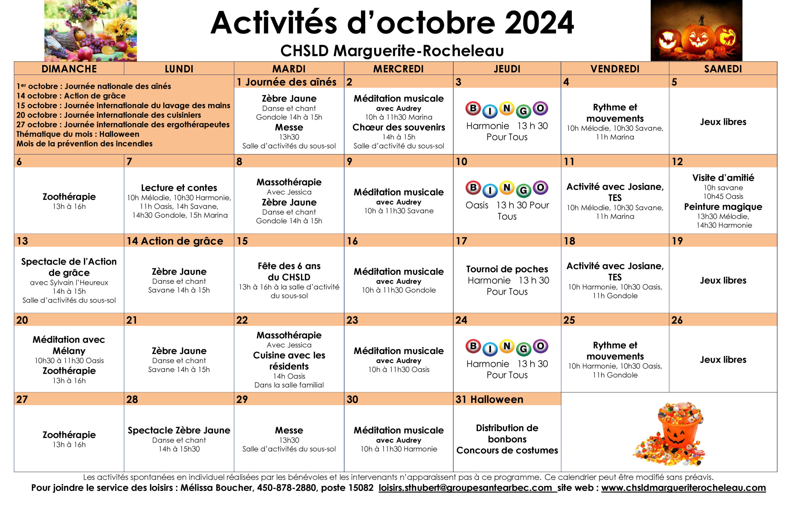 Calendrier des loisirs du mois d’octobre 2024 pour les résidents du CHSLD Marguerite-Rocheleau