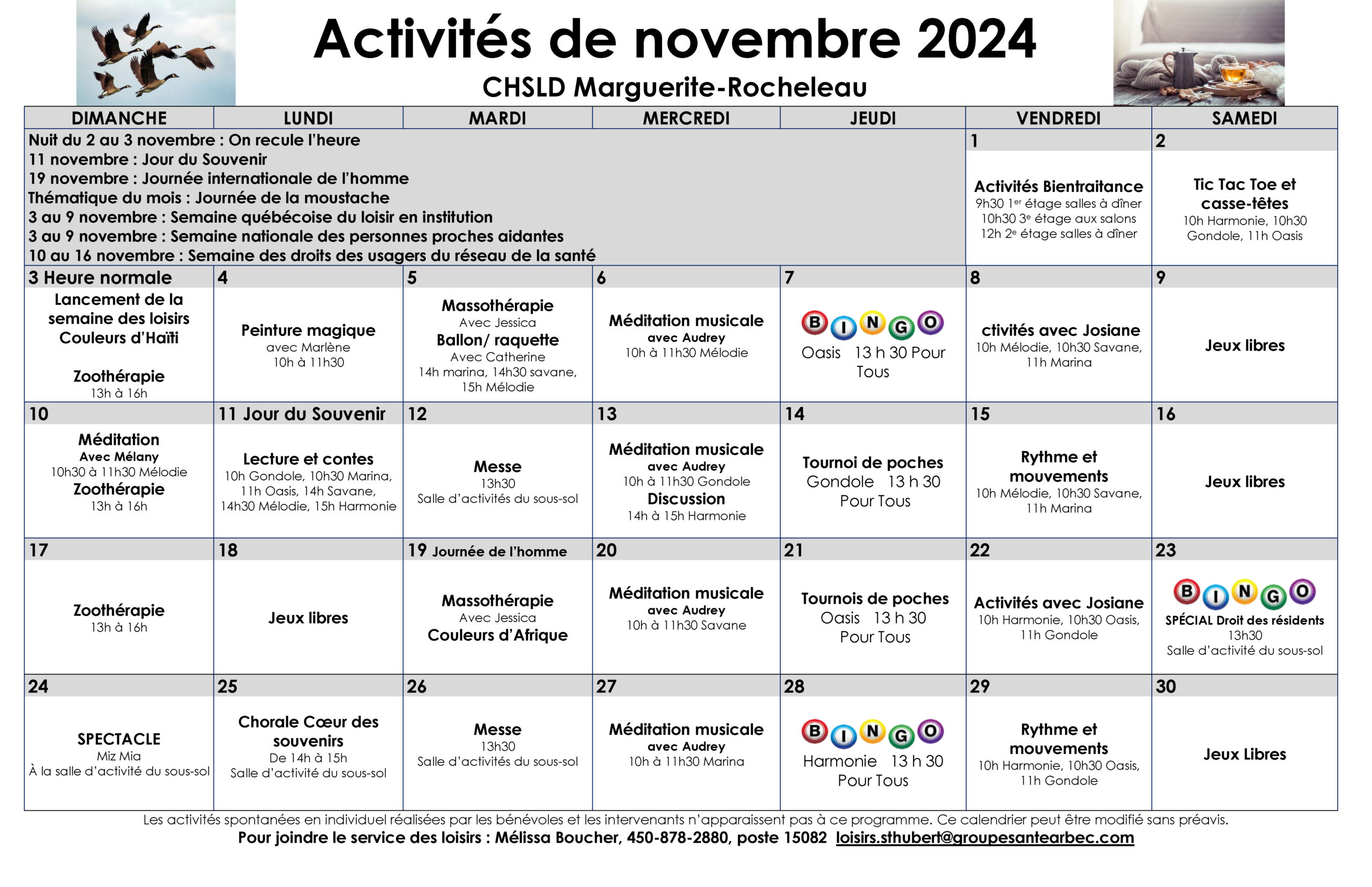 Calendrier des loisirs du mois de novembre 2024 pour les résidents du CHSLD Marguerite-Rocheleau