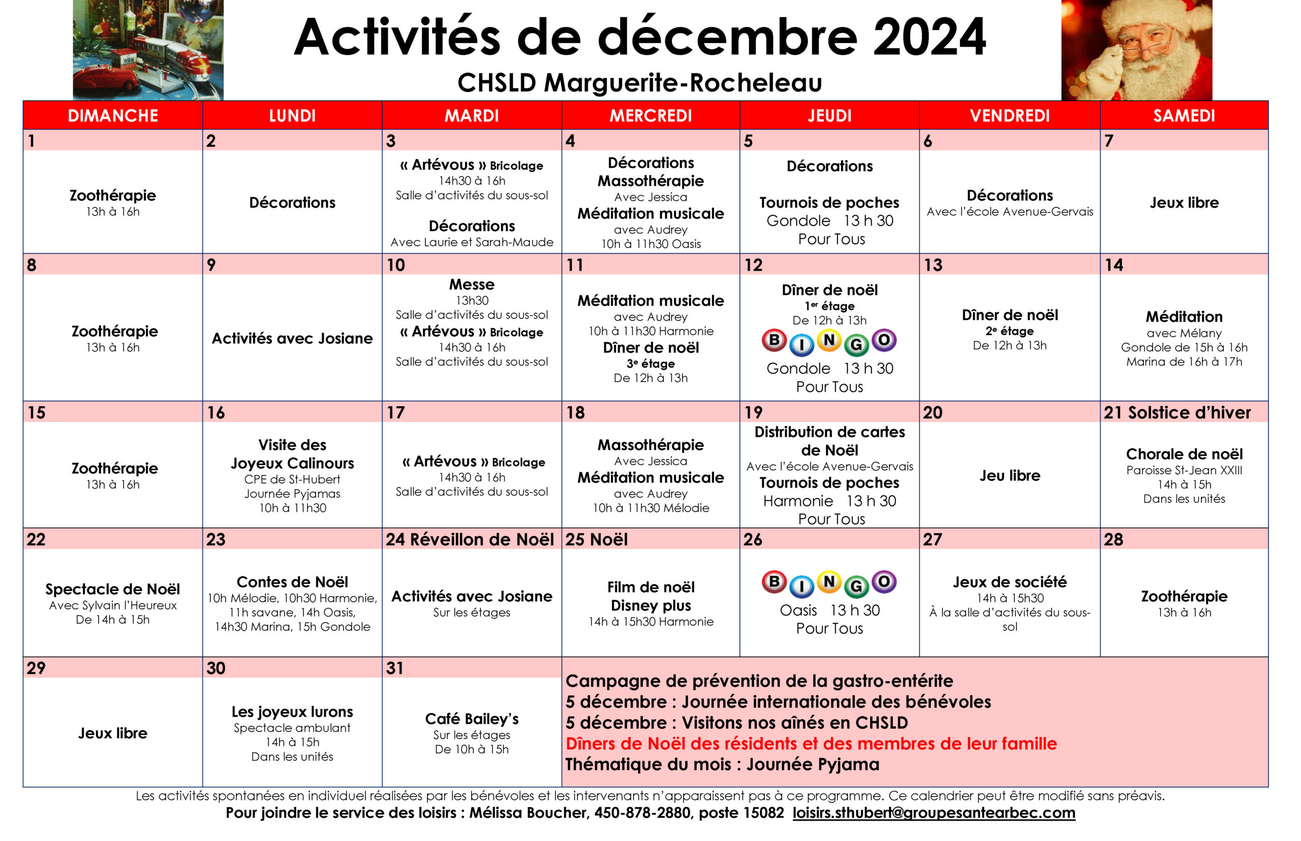 Calendrier des loisirs du mois de décembre 2024 pour les résidents du CHSLD Marguerite-Rocheleau