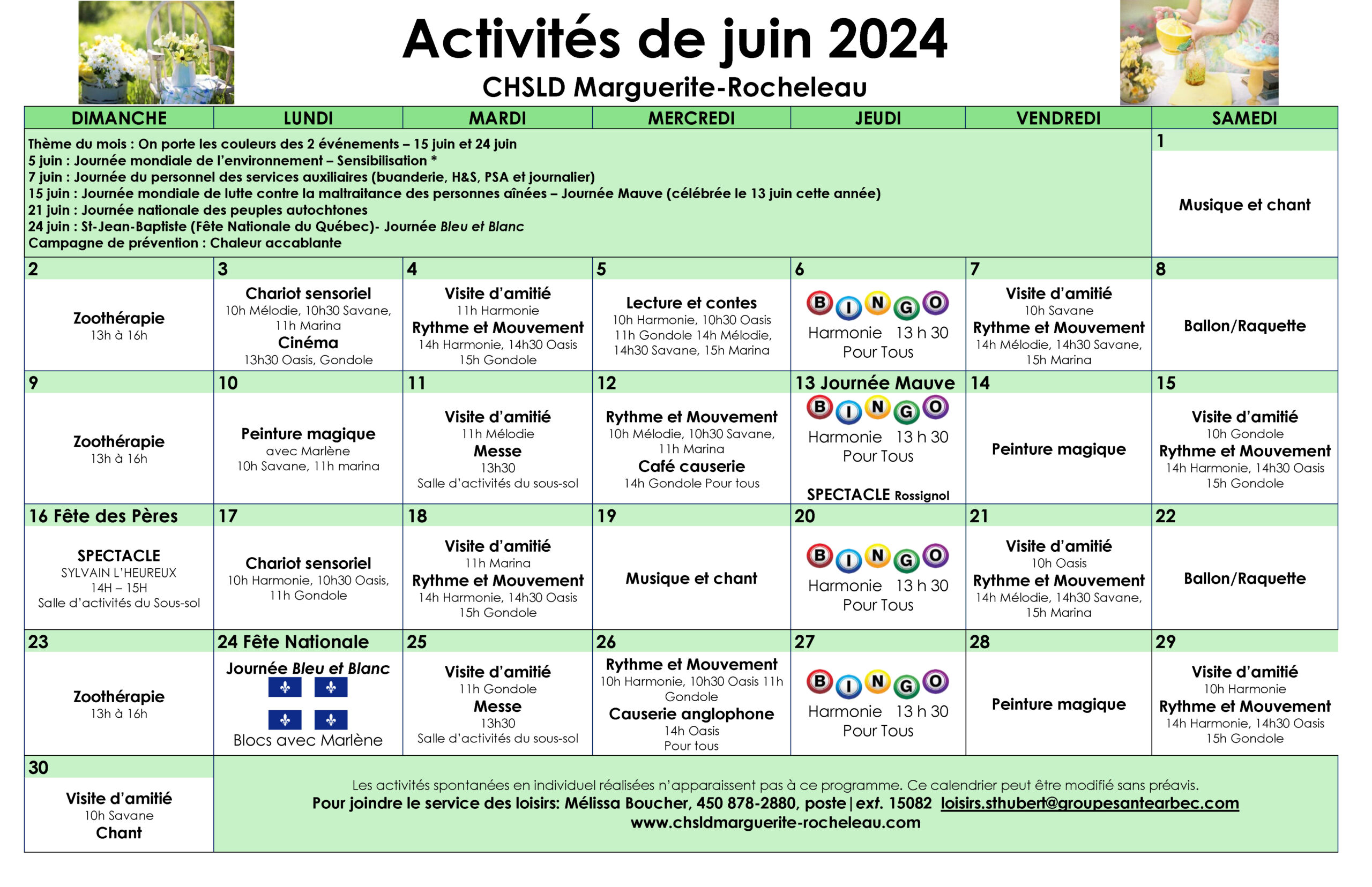 Calendrier des loisirs du mois de juin 2024 pour les résidents du CHSLD Marguerite-Rocheleau