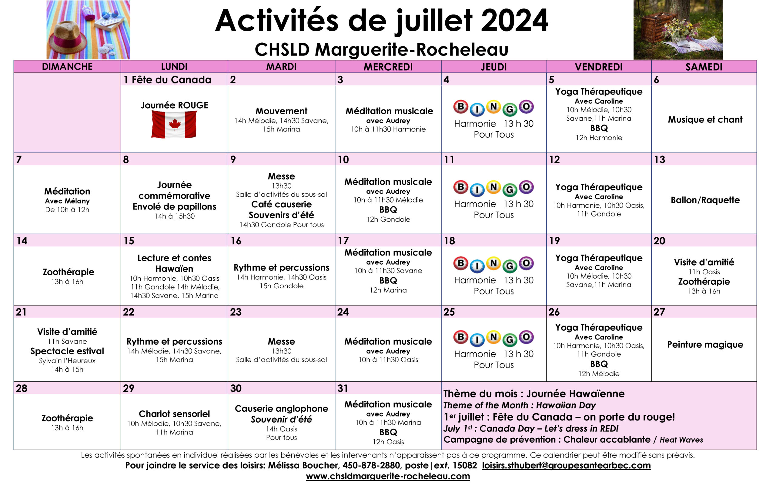 Calendrier des loisirs du mois de juillet 2024 pour les résidents du CHSLD Marguerite-Rocheleau