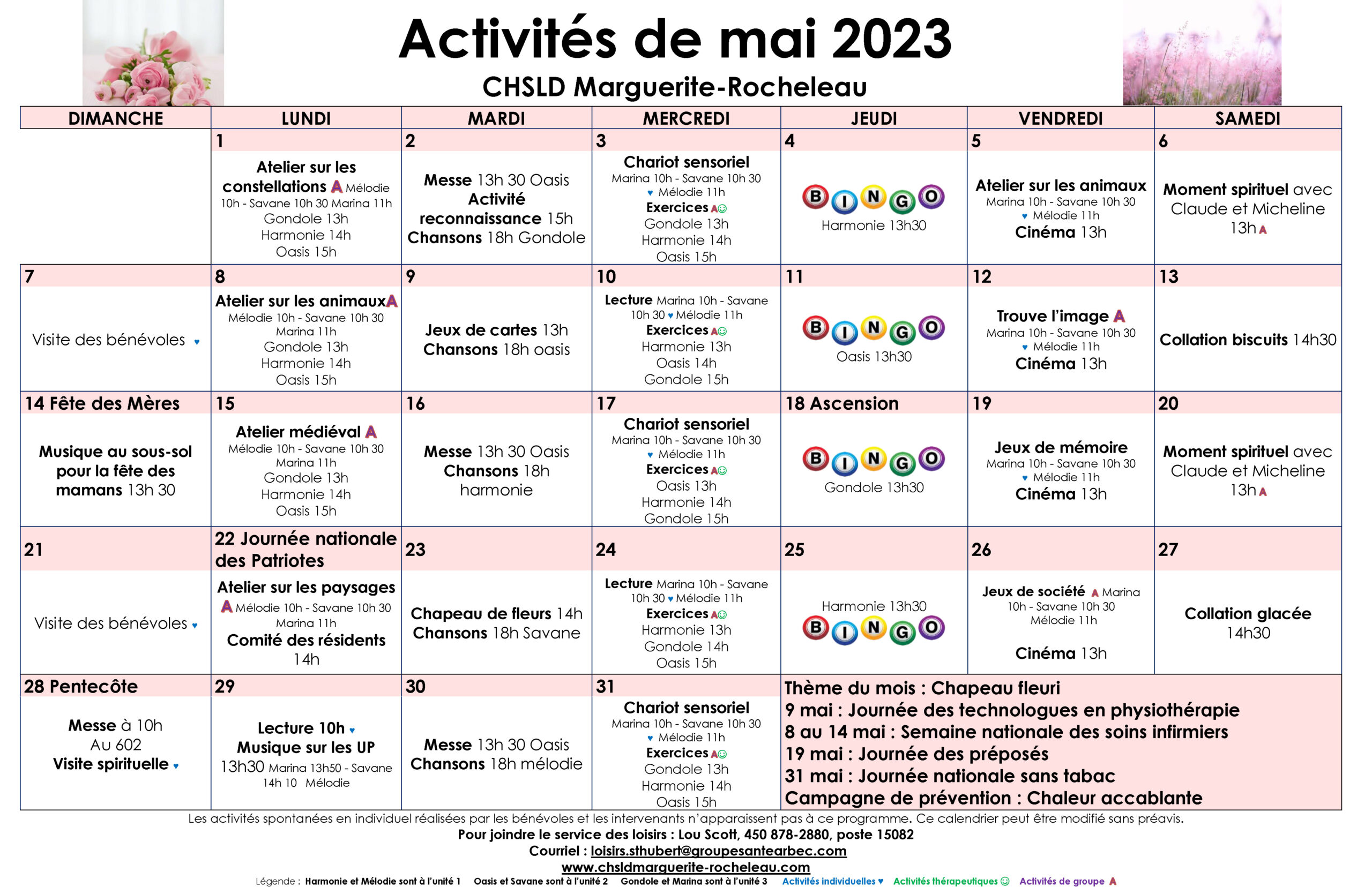 Calendrier des loisirs du mois de mai 2023 pour les résidents du CHSLD Marguerite-Rocheleau