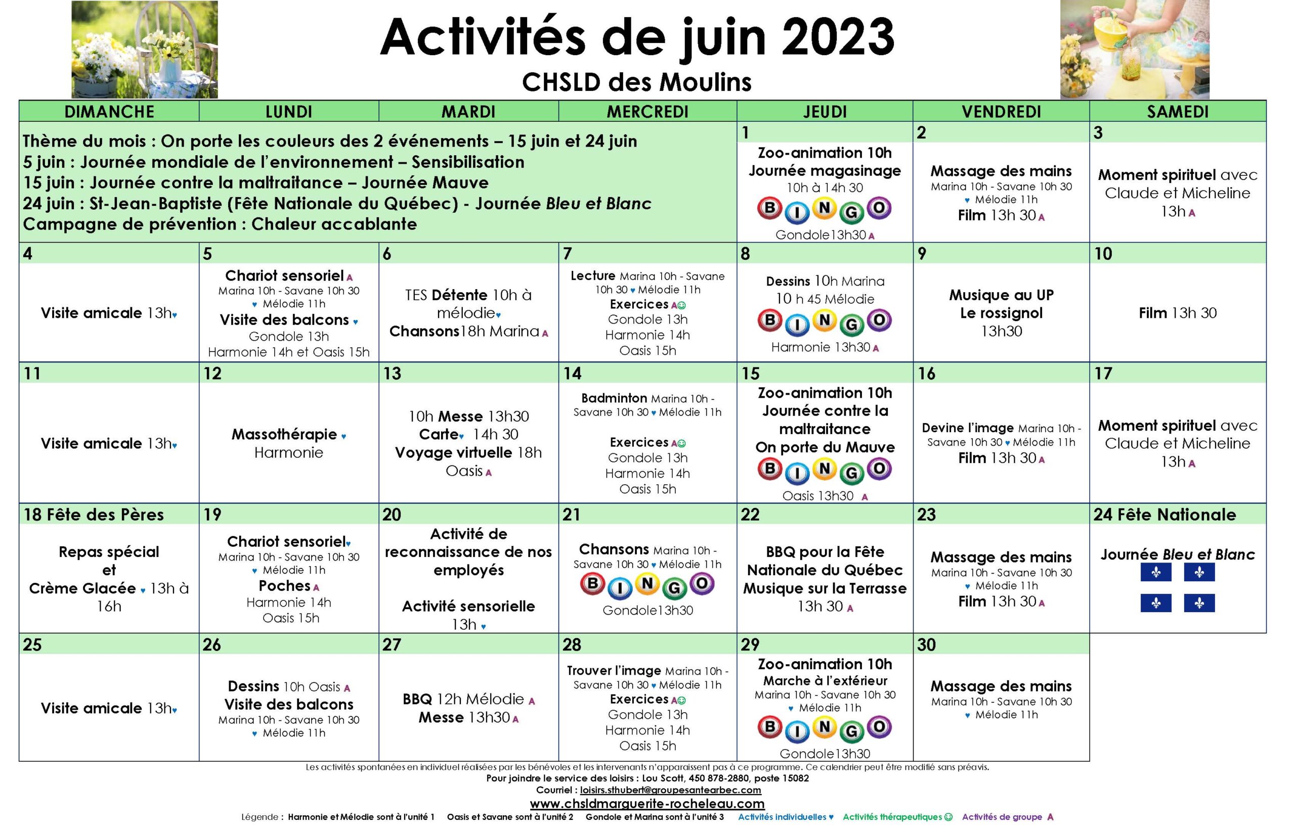 Calendrier des loisirs du mois de juin 2023 pour les résidents du CHSLD Marguerite-Rocheleau