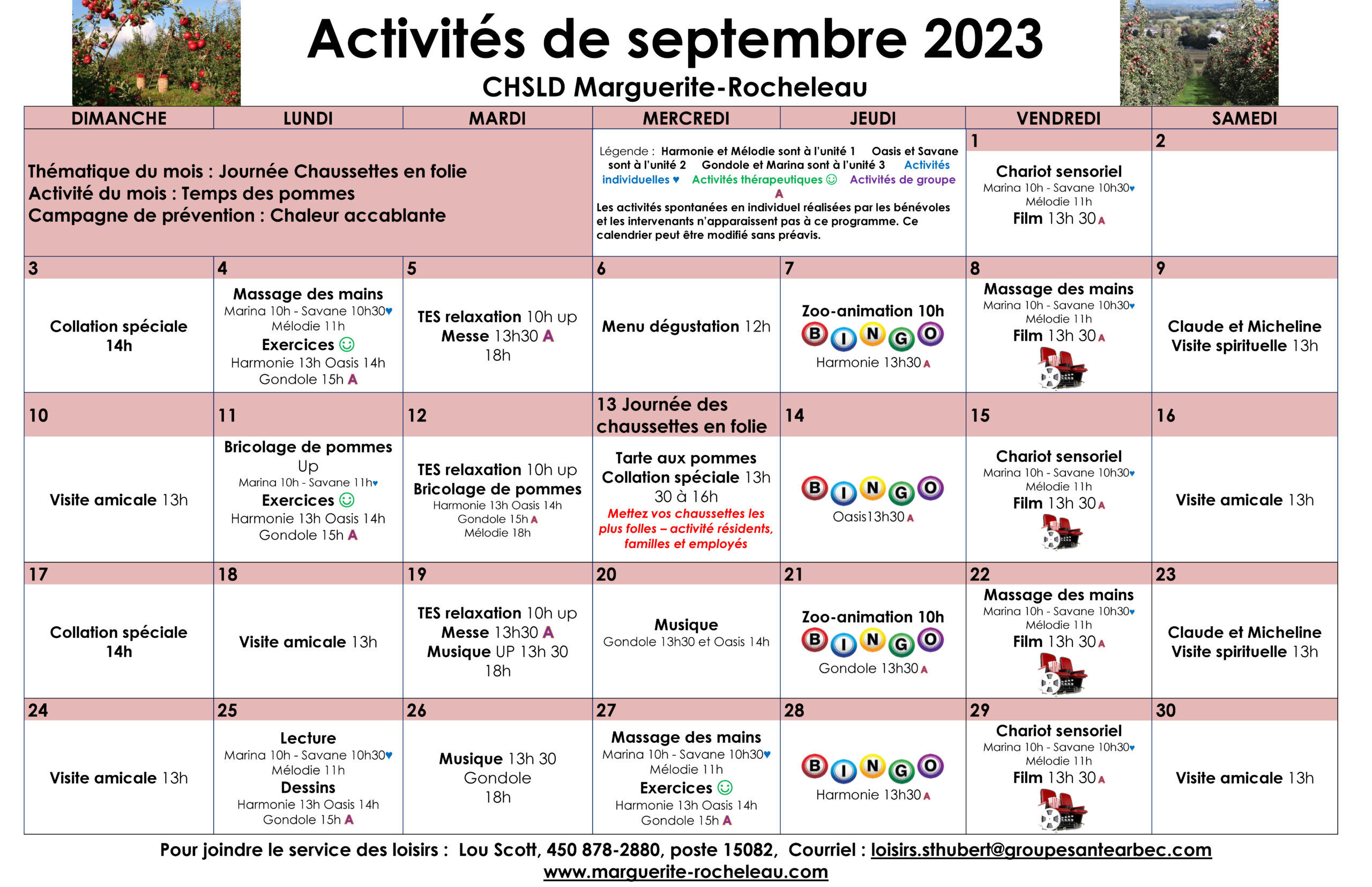 Calendrier des loisirs du mois de septembre 2023 pour les résidents du CHSLD Marguerite-Rocheleau